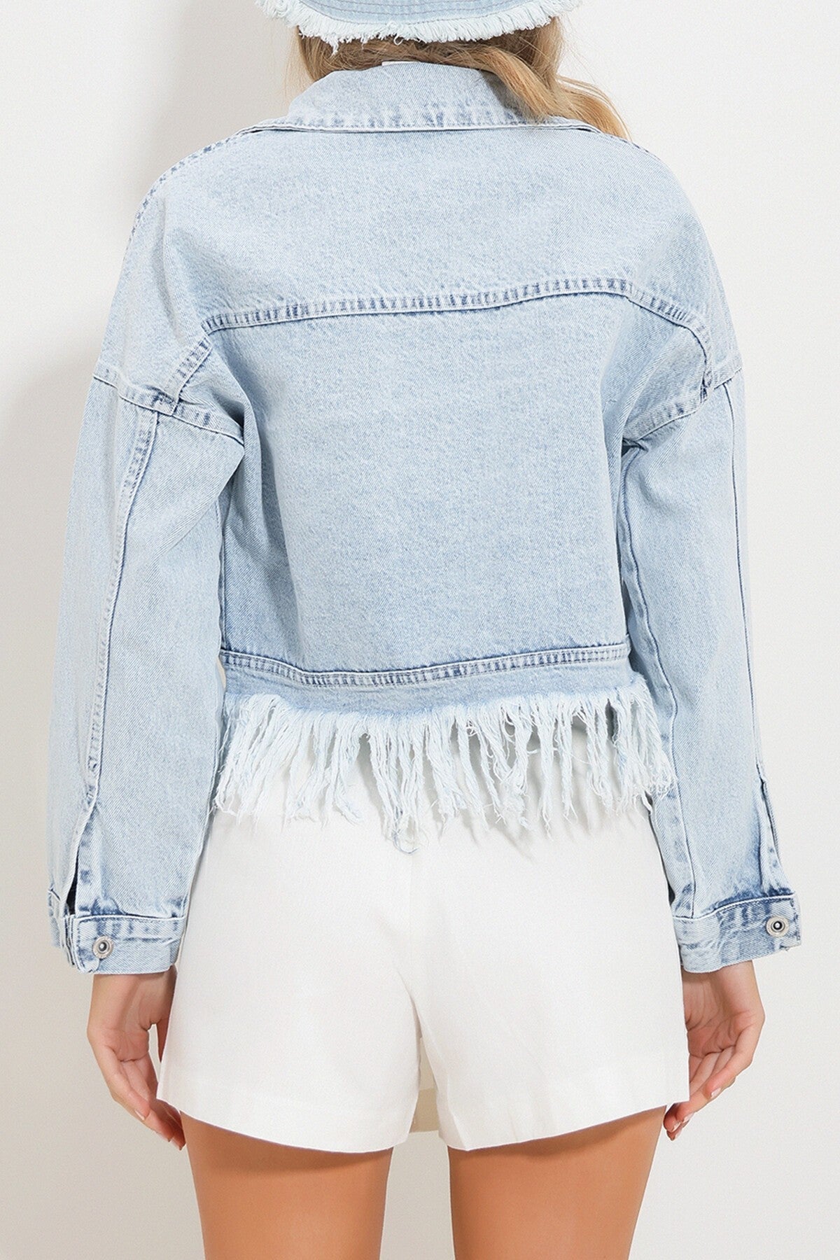 This ice-washed blue jacket features fringe details and dual pockets for boho-chic appeal. The cropped cut and vintage finish create a youthful, edgy silhouette.