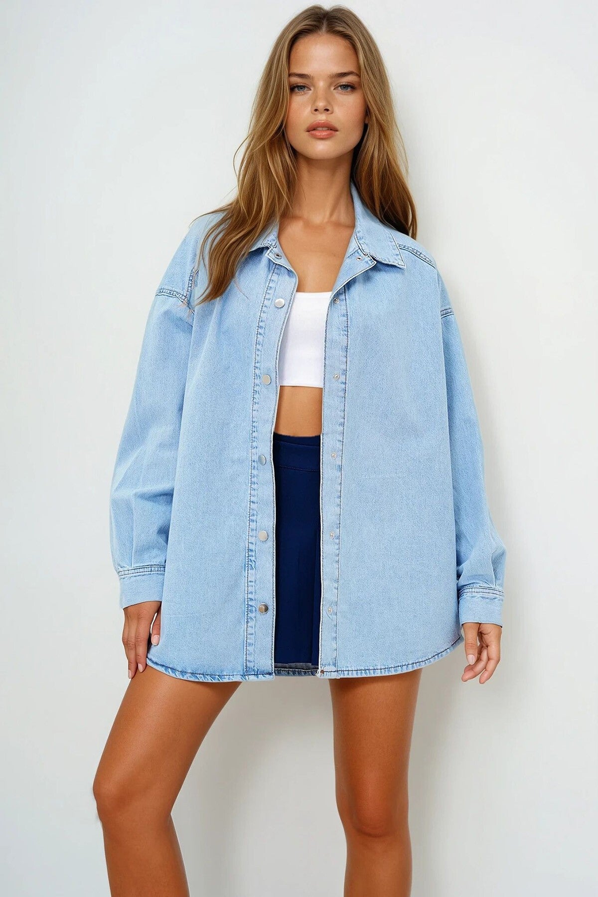 This light blue snap-button shirt redefines casual chic with its perfectly oversized fit and seasonal versatility. The premium denim fabric offers effortless style with a contemporary edge.