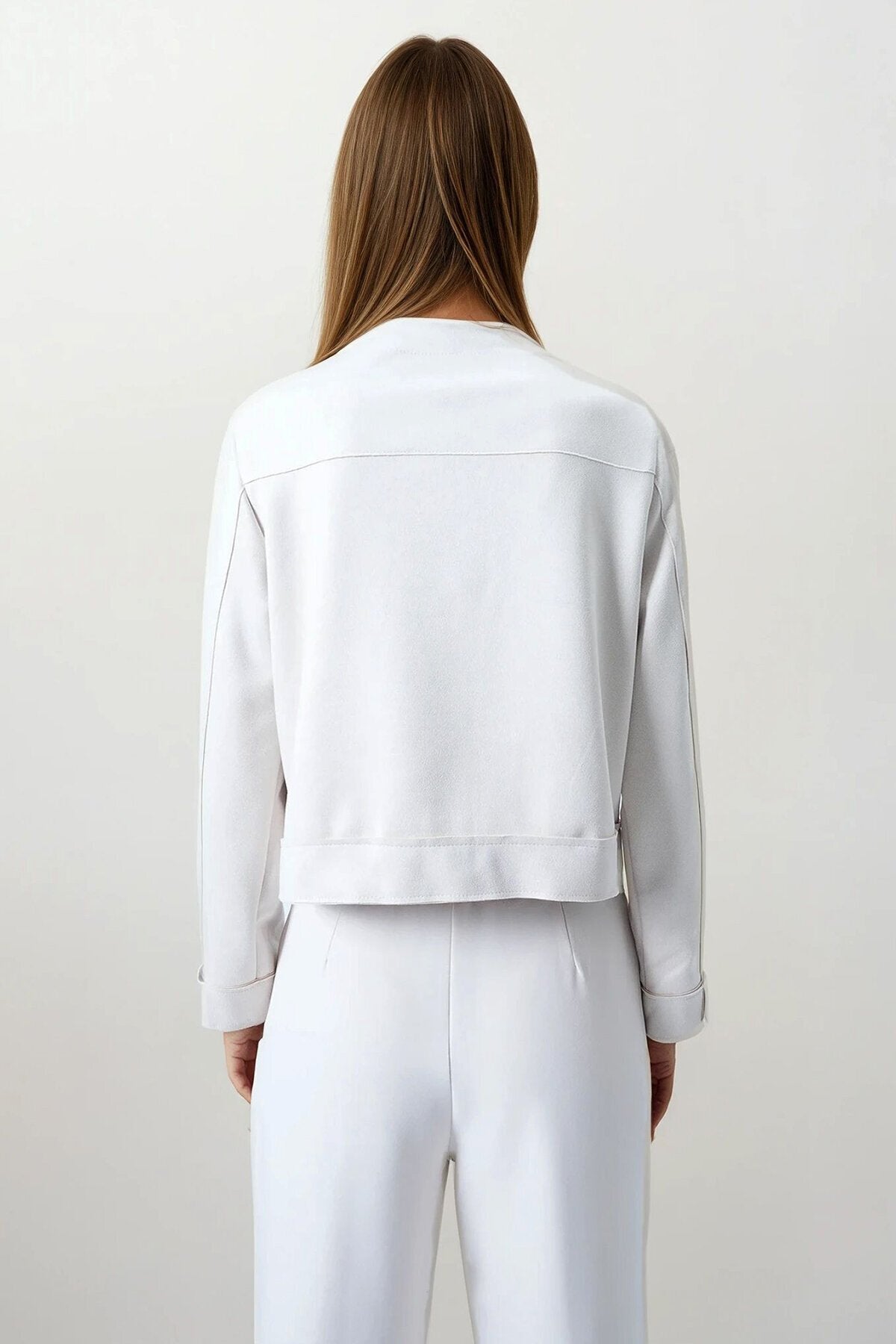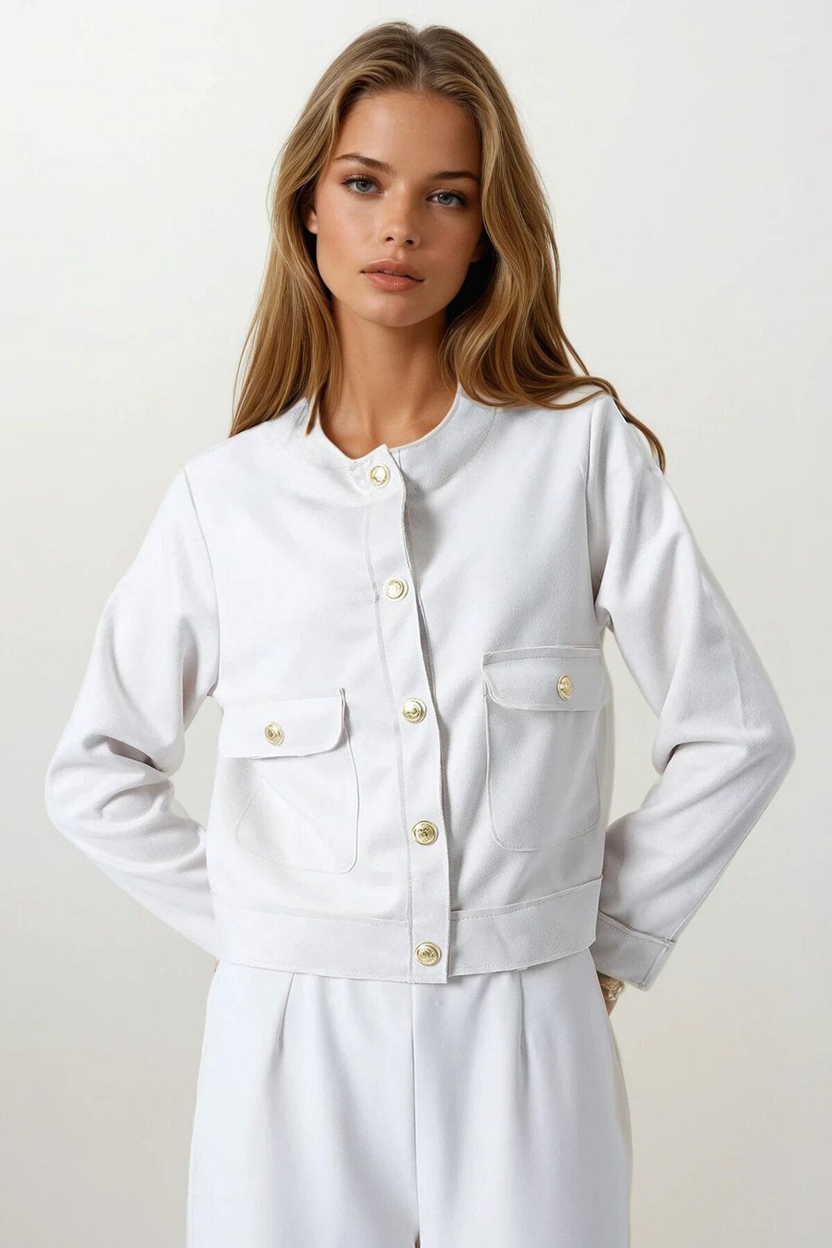 This elegant short jacket features dual flap pockets and sophisticated gold button accents. The versatile khaki color pairs effortlessly with any outfit.