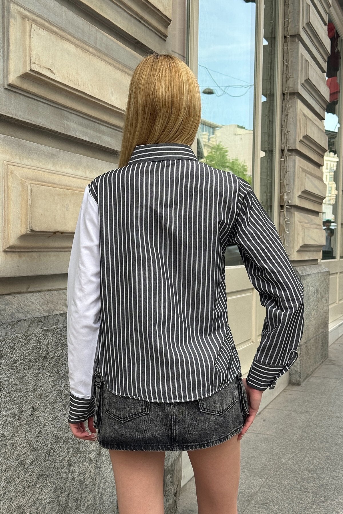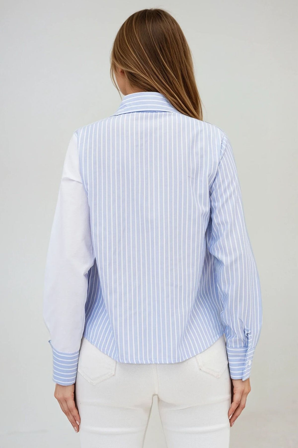 This sophisticated blouse features contrasting striped cuffs and an innovative asymmetrical button design. The modern twist on a classic shirt offers a unique yet timeless appeal.
